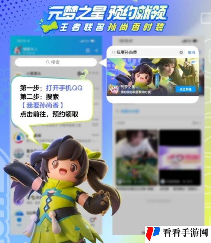 2、玩家在QQ内搜索“我要孙尚香”即可前往游戏预约页面,完成游戏预约之后即可获得“王者联名孙尚香时装”,在公测后使用预约账号登录游戏即可免费领取。